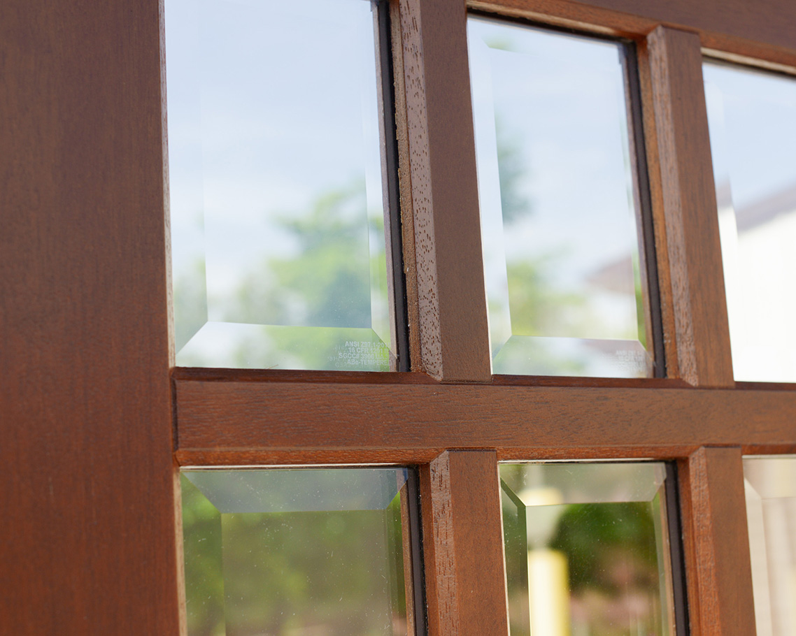 Solid Wood - Mahogany Craftsman Door, (Slab Size) 3' 0" x 6' 8",(Glass) Clear Beveled Glass, With Sidelite Quantity - Two, With Sidelite Width - 14", With Sidelite Glass - Clear Beveled Glass, Comes completely pre hung with compression weather stripping, door sweep, bronze aluminum threshold, matching species jambs and Brickmold.