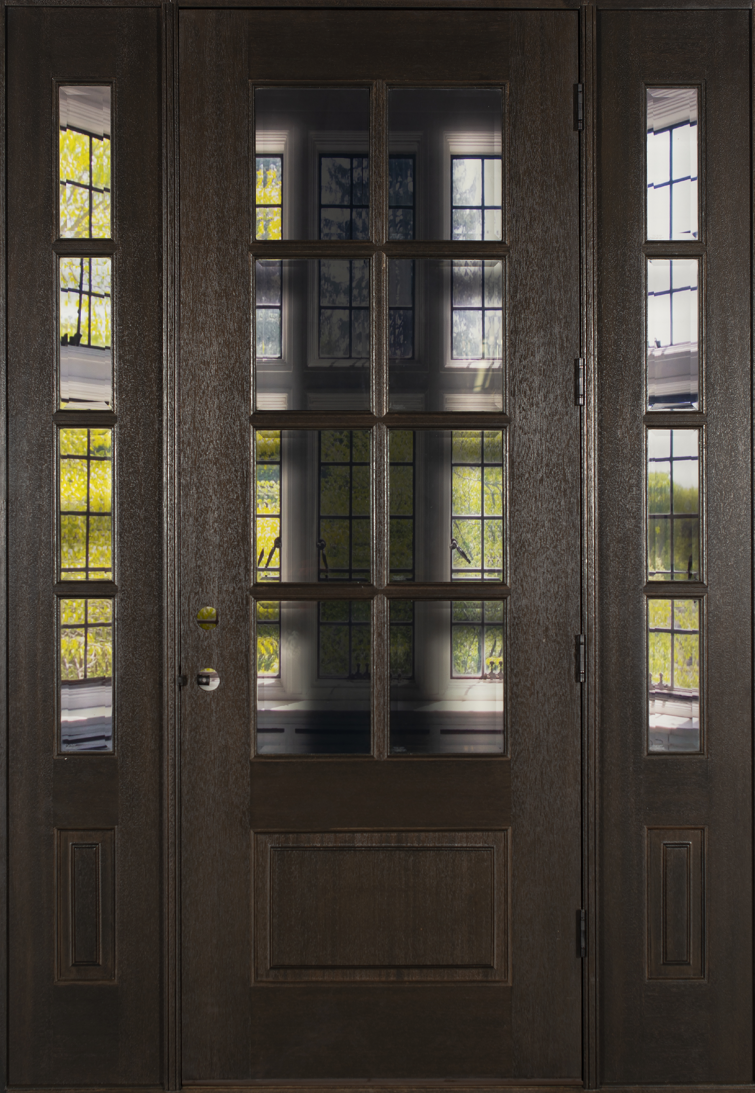 Solid Wood - Mahogany Door , (Slab Size) 3' 0" x 8' 0",(Glass) Clear Beveled Glass, With Sidelite Quantity - 2, With Sidelite Glass - Clear Beveled Glass (8 Lite Clear Beveled Door with 2 Sidelites(2-4 lite)), Comes completely pre hung with compression weather stripping, door sweep, bronze aluminum threshold, matching species jambs and Brickmold and Interior Casing.