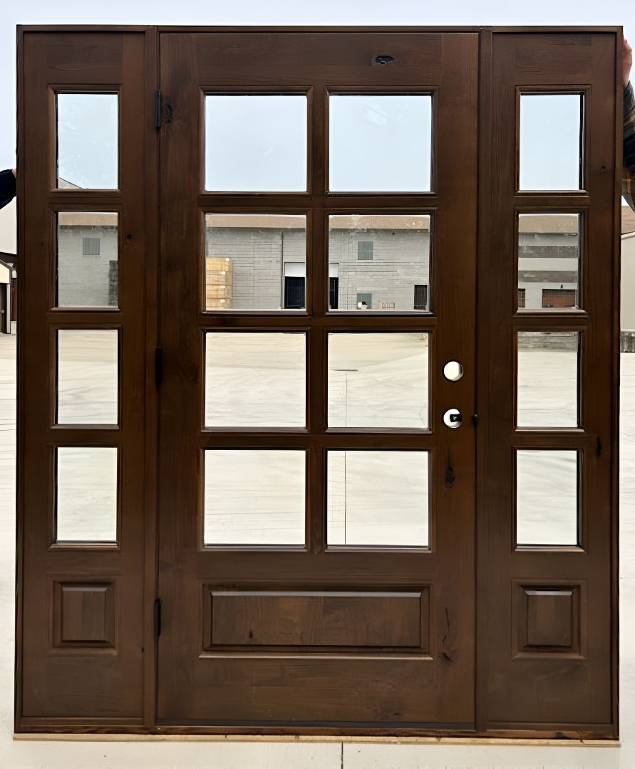 Solid Wood - Knotty Alder Door, (Slab Size) 3' 0" X 6' 8", (Glass) Clear Glass, With Sidelite Quantity - 2, With Sidelite Glass - Clear Glass, (Glass Description) Comes completely pre hung with compression weather stripping, door sweep, bronze aluminum threshold, matching species jambs and casing and Brickmold.