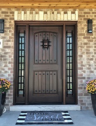 Solid Wood - Knotty Alder, With Sidelite Quantity - 2, With Sidelite Glass - Rain Glass(SW-100), Iron Grills on Speakeasy and Sidelights, Comes completely pre hung with compression weather stripping, door sweep, bronze aluminum threshold, matching species jambs and brickmold and Casing.